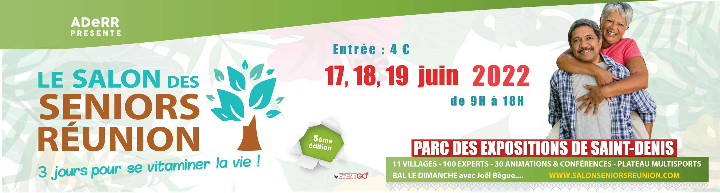 La 5e édition du Salon des Seniors Réunion se tient les 17, 18, 19 juin 2022 au Parc des Expos de Saint-Denis. Durant 3 jours, plus de 100 exposants permettront aux 50 ans et plus de s’informer dans tous les domaines, mais aussi de se divertir avec de nombreuses animations.